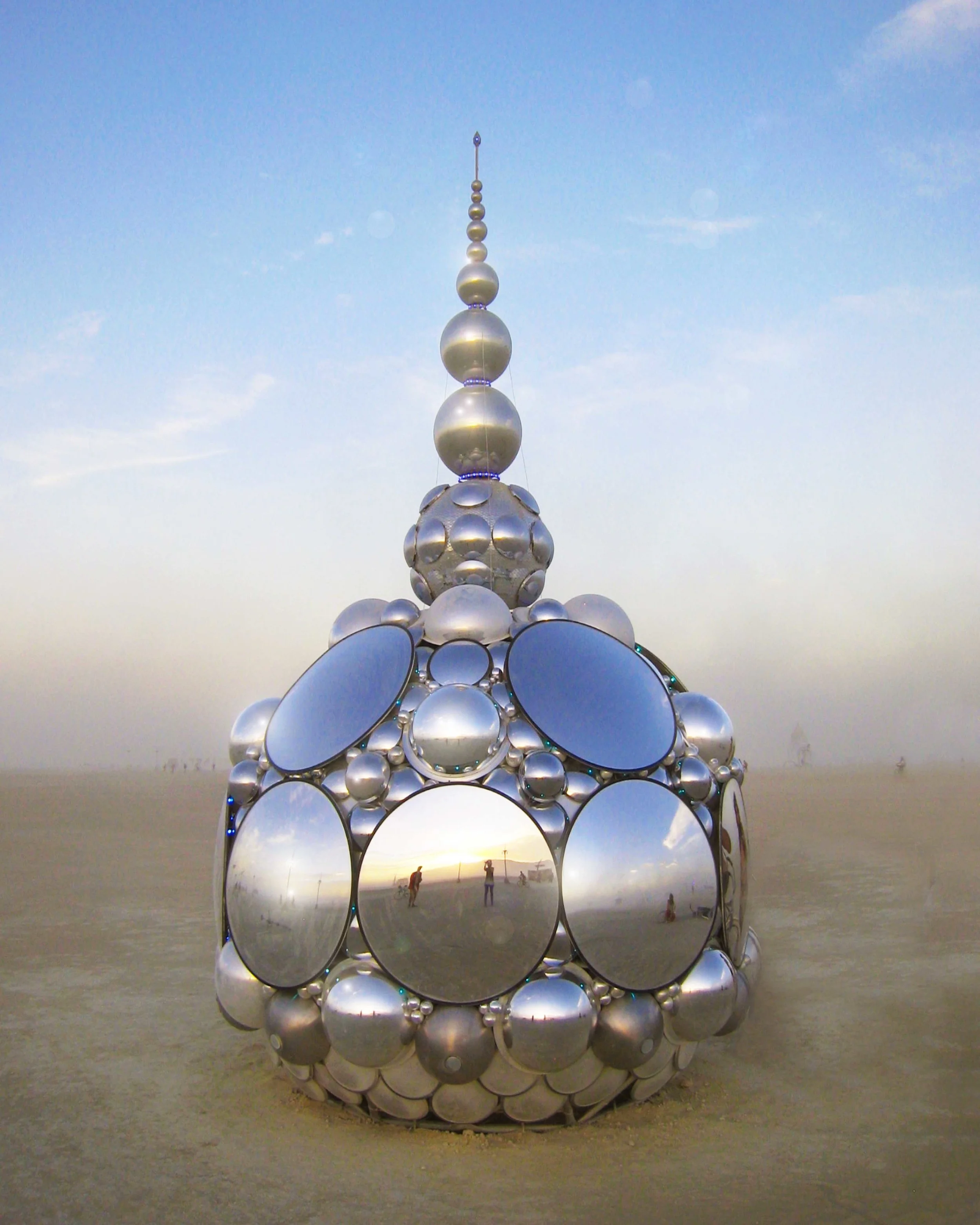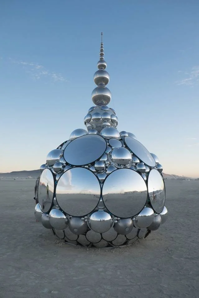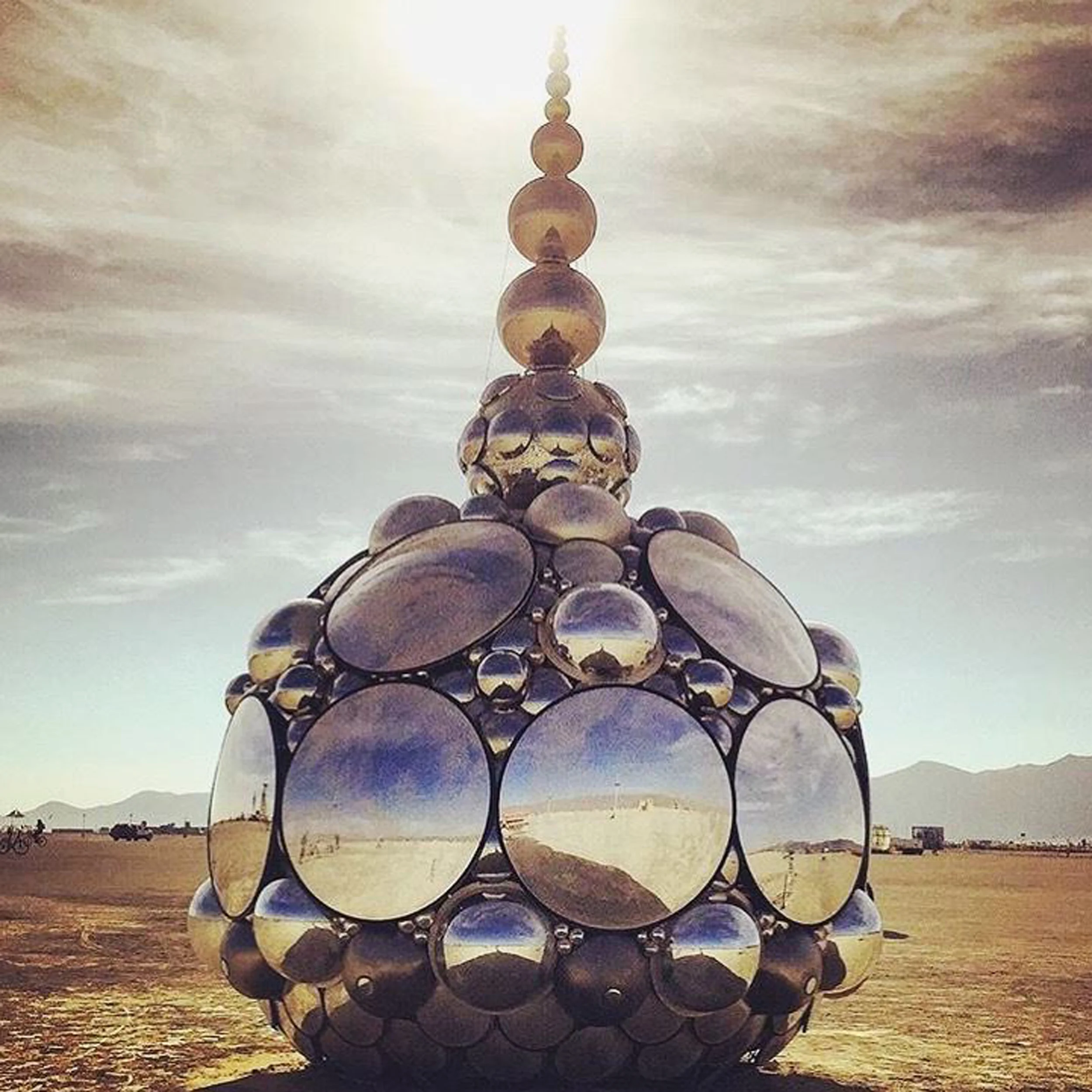 Up close, the sculpture reinforces a familiar sense of self by placing us at the center of each reflective lens. Stepping away, we see our image overlapping with everyone else’ – a composite of shared reflection..